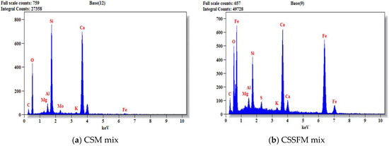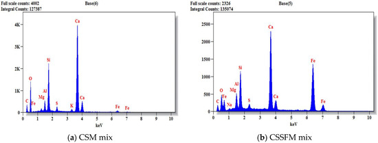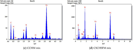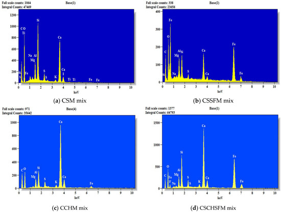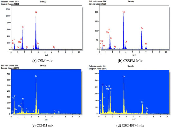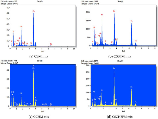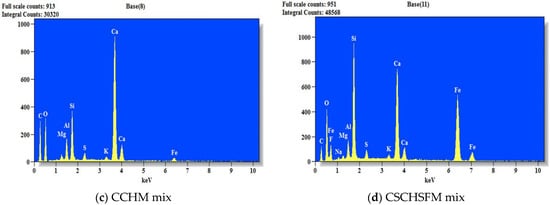 EDX analysis on Day 0 for CSM, CSSFM, CCHM, and CSCHSFM mixes.
