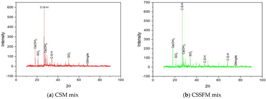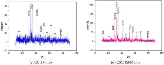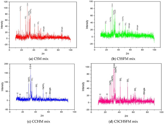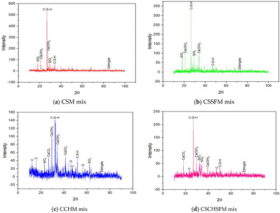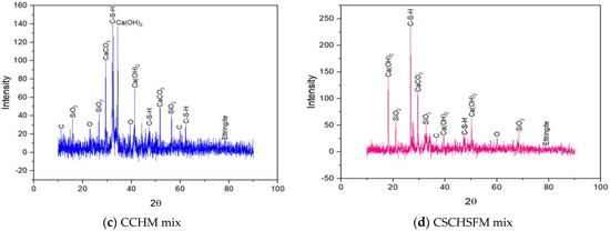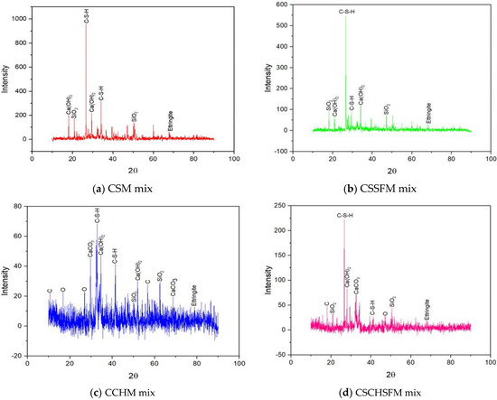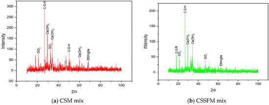 Analysis using X-ray diffraction was performed on samples CSM, CSSFM, CCHM, and CSCHSFM at ages 0, 1, 3, 7, and 28 days, and the results are shown in Figure 23, Figure 24, Figure 25, Figure 26 and Figure 27 [56], respectively. The purpose of these analyses was to investigate the phase nature of these materials and to identify the primary reacting compounds, which include ettringite, C-S-H, Ca(OH)2, and calcium hydroxide (CH) as the primary chemicals that can be identified by XRD. Table 5 shows that the intensity of the C-S-H peaks has increased while the strength of the rest of the peaks has decreased. Table 5 shows that the intensity of the C-S-H peaks has increased while the strength of the rest of the peaks has decreased. Table 5 presents the intensity count ranges for the C-S-H, Ca(OH)2, and ettringite compounds. These ranges are shown for each of the four mixes at varying ages. The intensity counts of the C-S-H compounds are high compared to the formation of the Ca(OH)2 compounds. This demonstrates no interruption of the pozzolanic reactions, which in turn has a substantial positive effect on the reduction of Ca(OH)2-(CH) in all of the mixes, which is advantageous for the quality of mortar strength.