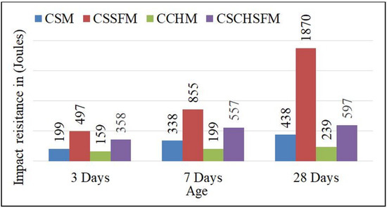 Regarding the impact resistance on Day 28, the initial crack resistance of the CSM mix is 398 joules (20 blows), and the final crack resistance is 438 joules (22 blows). Similarly, the impact resistance of the CSSFM mix is 1353 joules (68 blows) for the initial crack and 1870 joules (94 blows) for the final crack. Likewise, the initial crack resistance of the CCHM mix is 179 joules (9 blows), whereas the final crack resistance is 239 joules (12 blows). The impact resistance of the CSCHSFM mix is 358 joules (18 blows) for the initial crack and 597 joules (30 blows) for the final crack. The CSSFM and CSCHSFM mixes contain 6% crimped steel fibres, which improve the impact resistance in both the initial and final cracking compared to the CSM and CCHM mixes. As a result, the mortar mixes of CSM, CSSFM, and CSCHSFM mixes can be used for structural elements and the CCHM mix can be used for non-structural elements. Figure 28 and Figure 29 illustrate the impact resistance in joules for initial cracking and final cracking at various ages (3, 7, and 28 days) of the mortar mixes, respectively.