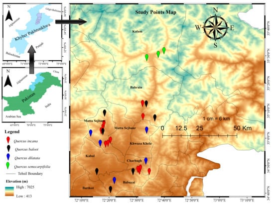 The temperate region vegetation of the Khyber Pakhtunkhwa province, distributed at elevation ranges from 1200–2000 m above agricultural fields and below the sub-alpine woodlands, is dominated by oak forests. These communities are either pure or admixed with coniferous forests forming a distinct vegetation structure and composition [1]. According to Alamgir [2], the overall area of oak forests is 16,700 hectares (41,500 acres) and is mostly used for fuel, small timber, fencing around agricultural fields, agricultural equipment, charcoal wood, tannin extraction, and thatching roofs [3]. Plant communities are typically complex ecosystems that constantly change in response to external factors and internal dynamics [4].