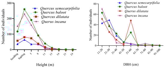 The height size classes of the Oak species show inverse J-shape distribution (Figure 2). The number of seedlings was lower than saplings in species indicating low regeneration potential. Similarly, the number of individuals in height size classes progressively decreases with an increase in height. The pattern of diameter at breast height (DBH) was the same for Q. semecarpifolia and Q. incana, in which the frequencies decreased with an increase in diameter at breast height. However, the pattern is a little irregular in Q. baloot and Q. dilatata e.g., in Q. dilatata frequencies of 11–20 cm DBH and 51–60 cm DBH were highest while the remaining DBH classes follow progressive decreasing trends in frequencies while in Q. baloot the trend is uniformed except for 51–60 cm dbh where the frequencies increases than the proceeding and preceding DBH size class.