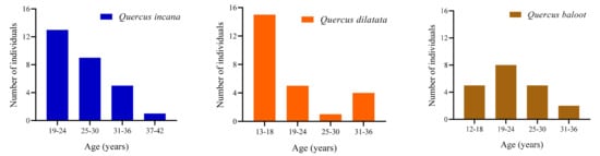 The stems stumped of three Oak species collected have age ranges between 13–42 years. The age structure of stands was dominated by Q. incana 19–25 age group (45%), followed by 25–30 (34%), while the remaining were trees aged between 31–42 years. Similarly, in Q. dilatata, the age group 13–18 years was highest (65%) while the rest ranged from 19–36 years. In Q. baloot dominated stands the age group 19–25 years was frequent (32%) followed by the age group 13–18 years and 25–30 years (25% each) while the rest were having age of 31–36 years. Overall, the age structure represents young communities with lower class classes in most of the stands dominated by Oak species (Figure 3).