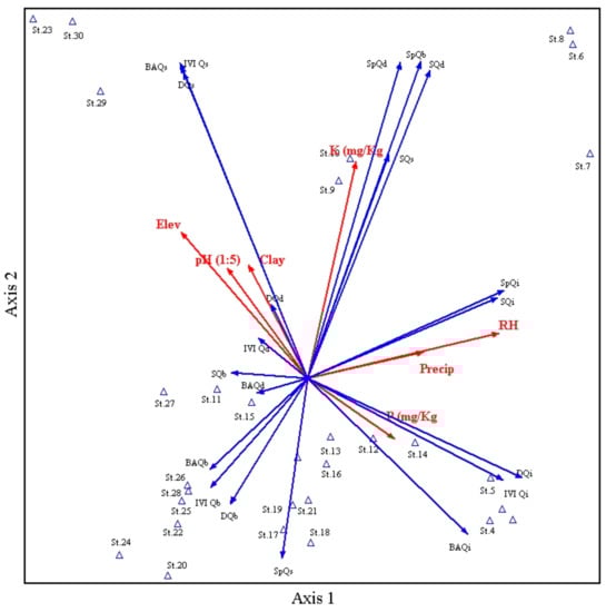 Axis 1 has the maximum biplot score for relative humidity (2.72), followed by precipitation (−1.65) and elevation (1.66). Similarly, on axis 2, Potassium (−1.88) and elevation (−1.46) revealed the highest biplot scores, respectively. In the two-dimensional biplot, these factors are presented as red arrows indicating their vital role in shaping the stand structure of an Oak-dominated forest.