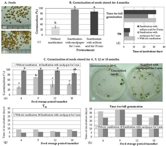 (A) Seeds (a) and lobs (b) of A. hermanniae; (B) Effect of scarification pretreatment on germination percentage (c), as well as time for full germination and T50 (d) of seeds stored for 4 months; (C) Effect of scarification pretreatment and storage period on germination percentage (e), T50 (g) and time for full germination (h) of seeds stored for 4–18 months; Typical seed germination at 20 °C of unscarified and scarified seeds (f); Germination took place in vitro in Petri dishes with solid half-strength MS medium at 20 °C, under 16 h photoperiod. Mean values (n = 5 repetitions of 10 seeds per dish) in each bar of subfigures (c,e) followed by the same lower-case letter do not differ significantly at p ≤ 0.05 by Student’s t test.