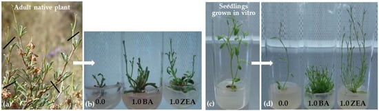 Characteristic morphology of A. hermanniae adult mother stems from which adult explants were excised (a) and typical in vitro response of adult explants (b); seedling morphology from which juvenile explants were excised (c) and typical in vitro response of juvenile explants (d). In vitro establishment took place in MS medium with marked cytokinin type and concentration (mg L−1).