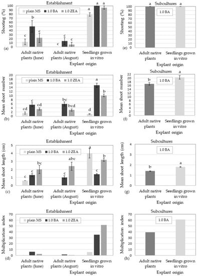 Explants obtained from in vitro grown seedlings were established at higher percentages, formed more shoots per explant, and showed a higher multiplication index compared to explants from adult native plants, which responded at slightly higher percentages in the beginning than at the end of summer (Figure 2b,d and Figure 3a,b,d). Regarding the contamination of explants from native plants, this occurred at a higher percentage in June (28%) than in August (7%). In both adult and juvenile explants, the highest values of shooting percentage and mean shoot number per explant were recorded in the substrate with 1.0 mg L−1 BA and the lowest in the control (Figure 3a,b). The medium with BA induced the most shoots, while that with ZEA the longest ones (Figure 3b,c).