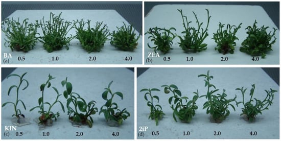Regarding tested cytokinin types and concentrations, BA at concentration 0.5–2.0 mg L−1 was the most effective for shoot multiplication, followed by ZEA, whereas explants response with KIN and 2iP was as poor as in the hf-medium. In A. barba-jovis though, BA and ZEA at 1.0 mg L−1 were equally effective in shoot multiplication []. Regarding shoot number during subcultures, juvenile and adult explants of A. hermanniae formed 20 and 16 shoots, respectively, which were more than double the number of shoots produced in A. barba-jovis, which reached a maximum of eight shoots per juvenile explant [,]. BA has been proved superior to ZEA, KIN, or 2iP in several works on Mediterranean plants [,,]