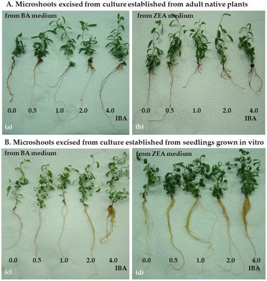 Characteristic rooting of A. hermanniae microshoots excised from culture established from (A) adult native plants and (B) seedlings grown in vitro and produced in medium with BA ((a,c)) or ZEA ((b,d)), respectively, in ½MS medium with marked IBA concentration (mg L−1).