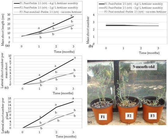 Effect of substrate type and fertilization on mean shoot length (a), mean shoot number (b), lateral shoot number per main shoot (c), lateral shoot number per plant (d), and canopy appearance (e) of A. hermanniae plantlets, during the period from April to July 2014 (n = 13), after transplantation on a peat-perlite substrate 2:1 (v/v) and application of monthly fertilization with 4 (F1) or 2 (F2) g L−1 fertilizer 20-20-20 or on enriched peat-perlite substrate 2:1 (v/v) without any extra fertilization (F3). In each subfigure, mean values in each month followed by the same lower-case letter do not differ significantly at p ≤ 0.05 by Student’s t test.