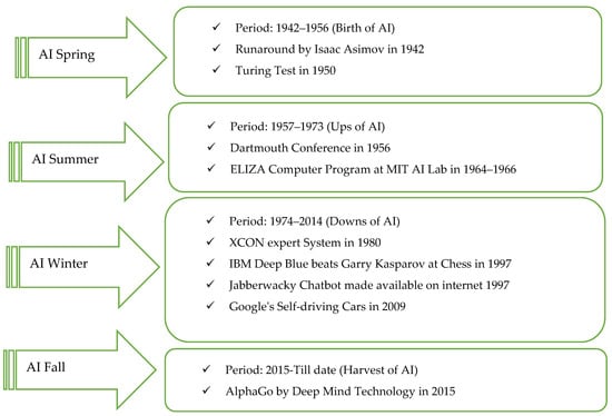 AI is the philosophy of machines to think, behave and perform the same or similar to humans [46]. It was introduced at the Dartmouth Conference in 1956 [47]. Since then, it has been a profound technology and has brought unparalleled success through speech recognition, image classification, reasoning, machine translation, and information retrieval [47]. AI uses a computer to emulate intelligent human behavior with the least amount of human participation possible [48]. In simple terms, AI is when a machine can reason, solve problems, and learn. For example, AI engine algorithms can now recognize new objects they have not seen before. It is typically characterized as a machine’s ability to learn from experience and new inputs and carry out tasks like a human being [49]. Figure 1 exhibits a brief history of AI and its season using [14,50].