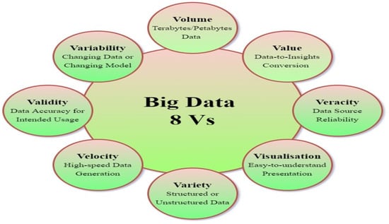 Digital data has outgrown traditional systems and methods [77]. Big data is everywhere, and data-driven discovery is a new computing paradigm [78]. Big Data is a term that refers to large amounts of structured and unstructured data that can be used to extract relevant information [10]. Gupta and Rani [77] point out that data capture, data storage, data manipulation, data management, data analysis, knowledge extraction, security, privacy, and are flooded with opportunities and difficulties as data grows. Emails and multimedia contents shared on different social media platforms alone generate countless gigabytes of data [49,79,80]. In simple, big data signify a new era in data exploration and data utilization for creating value [81]. By characteristics, big data is an enormous volume of data that cannot be managed using conventional data management techniques [82]. Big Data typically retains five characteristics: variety (diversity), velocity (real-time), volume (amount), veracity (quality), and value (worth) [13]. It remains an abstract term as new dimensions continue to be added over time. Many new features have been added to the definition of Big Data. As seen in Figure 2, Big data now has 8Vs: Volume, Velocity, Value, Variety, Variability, Validity, Viscosity, and Veracity [39].