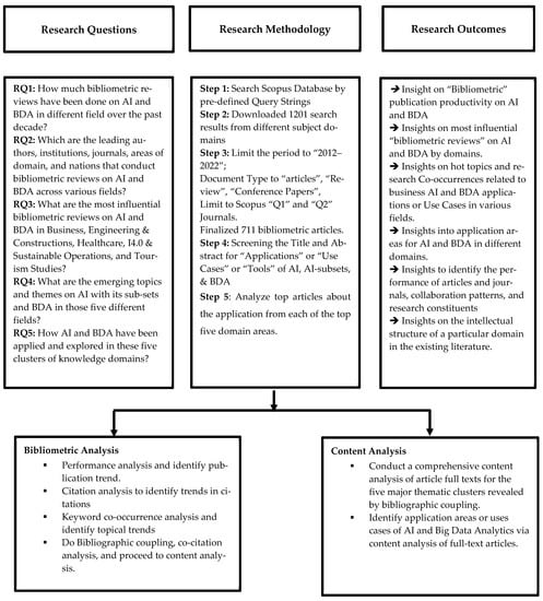 Table 2 shows the search criterion and article selection steps we followed for analysis. An advanced search was conducted using the TITLE, ABSTRACT, and KEYWORD criteria following the preparation of the query. To access standard bibliometric articles for the scope of our study, we restricted the results to “Articles”, “Conference Papers”, and “Reviews” in English-medium journals, yielding 1190 documents. We also conducted multiple online refinements. AI and BDA bibliometric reviews were in the single digits before 2010. Hence, we restricted the articles, conference papers, and reviews to the years 2012–2022. Second, only Scopus Q1 and Q2 quality criteria were used to filter the journals. In addition to using manual filtration techniques to eliminate irrelevant articles, we examined the relevance of each paper to the topic. This inclusion and exclusion criterion depended on the topic’s explicit coverage within the defined field of literature. The 711 bibliometric reviews that remained after the filtration process were used for additional bibliometric and content analyses. Specifically, these are all AI and AI-subsets-related bibliometric reviews published in Scopus Q1 and Q2 journals of different subjects.