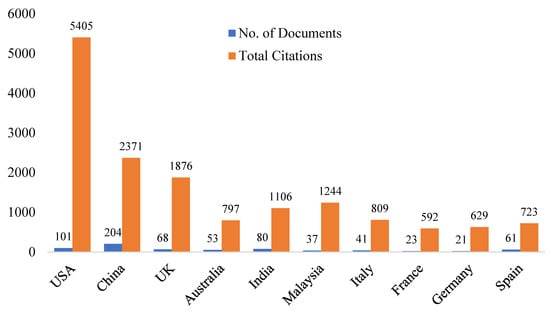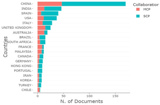 Figure 5 depicts the top ten influential bibliometric review contributing countries in different fields. We discovered that the United Kingdom, China, the USA, India, and Malaysia are the five most productive and influential nations. To clarify, we counted a country as productive and influential if at least one author is affiliated with a local institution in a country. For instance, if four authors from the United States, the UK, India, and China collaborated on a bibliometric article, each country will be credited once. Due to the intrinsic limitation of this approach, we also relied on the respective authors for additional information regarding national productivity. Figure 6 depicts the frequency of the most active countries by corresponding authors. Additionally, the ratios of Multiple Country Publications (MCP) to Single Country Publications (SCP) are provided.