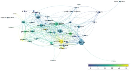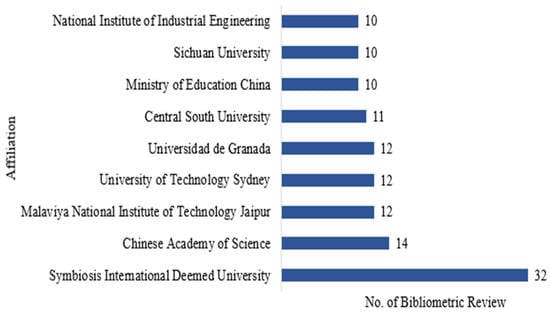 The most active and relevant research institutions/affiliations in bibliometric review contribution is exhibited in Figure 7. This information is helpful for identifying funding organizations, early-career researchers, potential collaborators, and students seeking research and post-graduate programs in AI and BDA-related fields. The top three active research institutions are Symbiosis International Deemed University, India (including Symbiosis Institute of Technology, Pune), with 32 Scopus Q1 or Q2 bibliometric articles. Chinese Academy of Science, China published 14 bibliometric reviews on AI or BDA, followed by Malviya National Institute of Technology, Jaipur, India, which published 12 articles employing bibliometric analysis. In India, Symbiosis International University (Private Deemed) contributed the most bibliometric reviews, whereas Public Universities in China contributed the majority of reviews. It indicates that the Chinese Government has already started to fund and promote impactful research in AI and BDA areas.