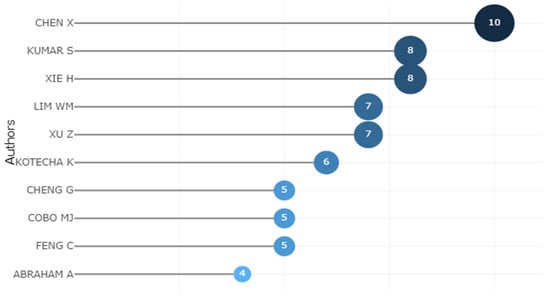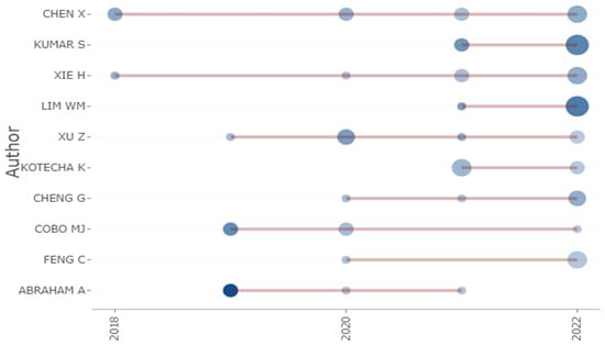 Finally, the most relevant research institutions or affiliations are presented in Figure 7. Figure 8 displays the most relevant authors with the highest number of bibliometric review contributions. We identified the top 10 most relevant authors published between 2012 through 23 October 2022.