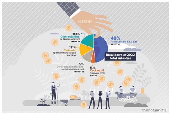 - Yeap, C. Special Report: At RM77.7 bil, Subsidies Exceed Budgeted Development Expenditure in 2022. Available online: https://www.theedgemarkets.com/article/special-report-rm777-bil-subsidies-exceed-budgeted-development-expenditure-2022 (accessed on 20 October 2022).
