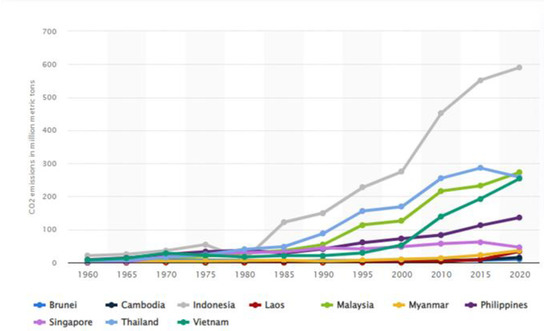 - Von Kameke, L. Territorial Carbon Dioxide (CO2) Emissions in Southeast Asia from 1960 to 2021, by Country; Statista: Hamburg, Germany, 2022. [Google Scholar]