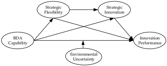 This study follows resource-based theory [,] and integrates BDAC, strategic flexibility, strategic innovation, innovation performance and environmental uncertainty into a conceptual model to investigate the possible mediating role of strategic flexibility and strategic innovation and the moderating role of environmental uncertainty between BDAC and innovation performance to fill these gaps. This study is significant for enterprises to improve their innovative performance levels amid fierce competition. Specifically, this study explores the following three questions: (a) whether BDAC boosts a firm’s innovation performance; (b) whether BDAC increases a firm’s strategic flexibility and strategic innovation, thereby contributing to its innovation performance; and (c) whether the effect of BDAC on innovation performance is contingent on environmental uncertainty.