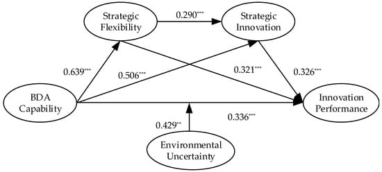 Strategic flexibility refers to a firm’s ability to reallocate and reconfigure its existing resources, processes and strategies to adapt to the changing environment [,]. Rialti et al. [] suggested that BDAC can contribute to a firm’s strategic flexibility through the mediating role of firm ambidexterity. It seems that BDAC can be an antecedent variable of strategic flexibility. A firm with high strategic flexibility may result in new competencies, creative technologies and novel business models [,], thereby helping it obtain superior strategic innovation []. Strategic innovation involves the reconceptualization of the business model and reshaping existing markets by breaking the rules and changing the nature of competition to obtain a significant value improvement for customers and growth for firms []. Probably, strategic flexibility can be an antecedent variable of strategic innovation. Furthermore, strategic innovation could turn into a firm’s innovation performance []. Innovation performance specifically refers to the outputs, effect and speed of a firm’s innovations []. Accordingly, strategic flexibility and strategic innovation may play serial mediating roles between a firm’s BDAC and its innovation performance. Additionally, BDAC is one type of dynamic capability [,,], and the effect of dynamic capability on performance was theorized as contingent on the external environment []. Nevertheless, few prior studies have shed light on the mediating role of strategic flexibility and strategic innovation and the moderating role of the external environment (e.g., environmental uncertainty) on the relationship between BDAC and performance.