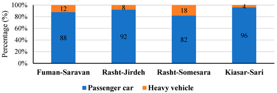 In the present study, vehicular platooning variables and performance measures were examined as the empirical data from four sites of two-lane roads in the Gilan and Mazandaran provinces of Iran, including Rasht-Somesara, Fuman-Saravan, Rasht-Jirdeh, and Kiasar-Sari roads. During the collection of the field data, traffic flow varied, and the traffic included mainly drivers with light or heavy vehicles. In addition, the speed limit was 90 km/h, and the width of each road lane was 3.65 m. Figure 1 represents the composition of the traffic flow by the vehicle type passing on the two-lane roads. As shown in Figure 1, Kiasar-Sari’s maximum percentage of passenger cars is about 96%, and the minimum percentage of heavy vehicles is approximately 4%. However, Rasht-Somesara’s maximum percentage of heavy vehicles was about 18%, and the minimum percentage of passenger cars was nearly 82%.