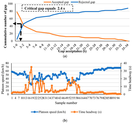 Examination of time headway, including gap-acceptance behavior and platoon speed: (a) 1-s time interval of time headway for vehicle-gap-acceptance behavior and (b) relation between platoon speed and time headway.