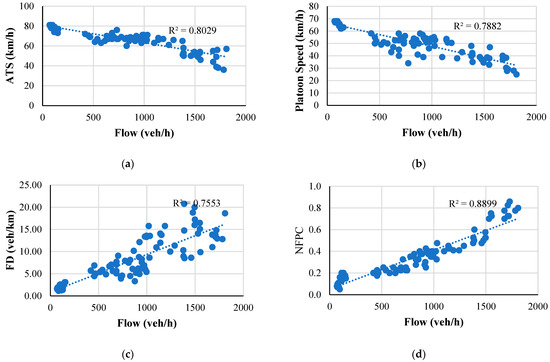 For an analysis of the effect of platooning variables and performance measures in MLR and BLR models, see Table 4 and Table 7 and Figure 4, which depict the results of the highest relationships. As displayed in Figure 4, traffic flow has a strong relationship with NFPC, ATS, platoon speed, and FD, in that order. This means that an increase in traffic flow leads to a decrease in ATS and platoon speed and an increase in NFPC and FD. Further, according to the results of Figure 4, the most-influential platooning variable on performance measure regarding R2 coefficient is the relationship between flow and NFPC, compared with other variables, as verified by the results in Table 4 and Table 7. Thus, the best predictive model for representing the surrogate performance measure is the relationship between flow and NFPC in the MLR and BLR models.