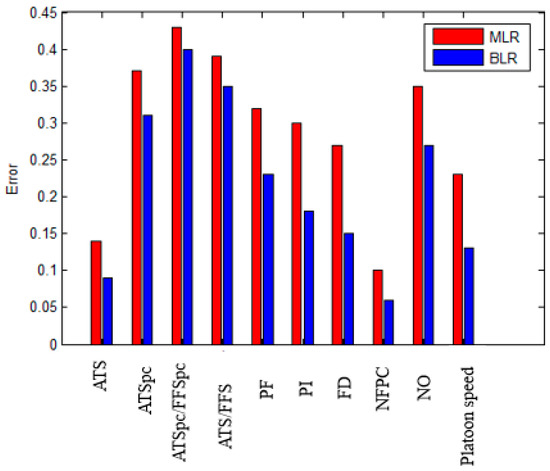 The prediction performance for the MLR and BLR models, using performance measures under vehicular platooning, is compared with the mean absolute percentage error (MAPE). The purpose is to select the best predictive model in terms of acceptable error and accuracy by using Equation (23), which is expressed as follows [30,80]: