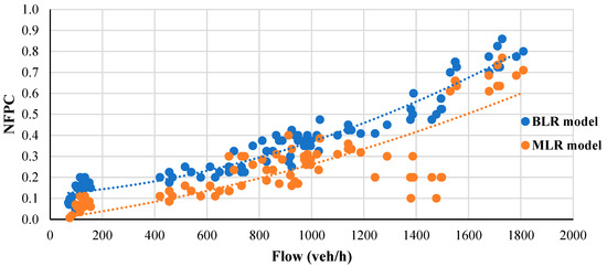 Further, for the validation of and a comparative evaluation of the proposed models regarding the best fit for platooning variables and performance measures, the results of the predicted performance measures are examined via empirical data, and each measure’s error (MAPE) under platooning variables is presented in Figure 5. As shown in Figure 5, the BLR model has worse error prediction performance compared with the MLR model. Further, the lowest error is related to NFPC in each model, suggesting that selecting this measure is an optimal choice as a surrogate performance measure among the performance measures, compared with other measures. Moreover, regarding the relationship between flow and NFPC in both models, the results of the best fit models and errors are obtained for MAPE according to Equation (23) (Table 8 and Figure 6). According to Table 8, the BLR model is the best predictive model for evaluating NFPC under traffic flow. Further, it can be inferred that the BLR model can predict NFPC as the most-influential performance measure to classify the LOS of two-lane roads by using statistical analysis and overall error values (Figure 6). Therefore, using BLR, based on the conjugate Bayesian analysis, is proposed as a predictive tool for determining the effect of platooning variables on performance measures thanks to its fewer errors and high prediction performance compared with the MLR model. The results indicate that conjugate Bayesian analysis offers better prediction performance in comparison with the MLP model. These results are the same as the results of other studies, which showed that the BLR model is better than MLR in other engineering fields [30,76,77].