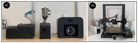Equipment used for filament production and sample preparation: (a) l–r: shredder, dryer, and filament maker from 3Devo, (b) FFF printer Ender 3 from Creality3d.
