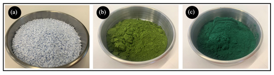 Materials used for filament production: (a) PETG granules produced by cutting and shredding Formfutura HDglass filament, (b) Chlorella vulgaris spray dried powder obtained from Algenium GmbH, (c) Spirulina platensis spray dried powder from Algenium GmbH
