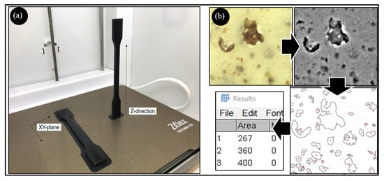 (a) Exemplary representation illustrating the examined print orientations, with flat printed parts labeled XY and upright printed parts labeled Z (b) process flow of particle analysis in ImageJ: source picture -> binary black and white picture -> outlines after “analyze particles” function -> surface area for each particle used to calculate average diameter