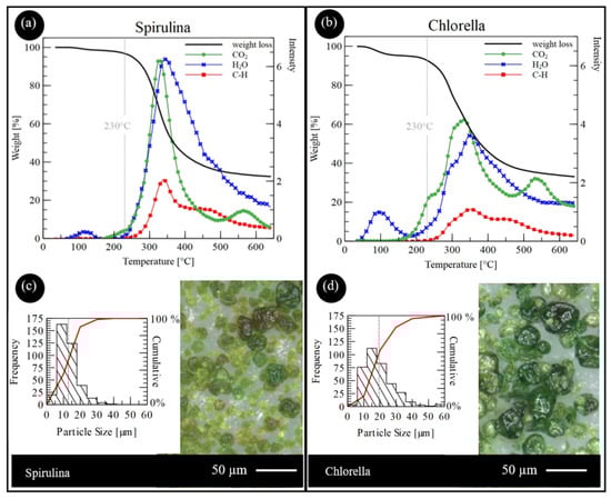 Results from filler characterization: (a,b) TGA results showing weight loss curves of the materials under temperature influence, superimposed with the detection of released decomposition products measured by FTIR; (c,d) microscope images and frequency and cumulative particle size distribution of the untreated algae samples