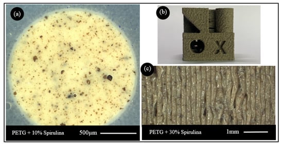 After manually compounding the PETG and spirulina powder, filaments could be extruded up to a maximum filler content of 30 wt.%. Higher concentrations lead to reduced extruder throughput and unstable extrusion results. It was possible to produce 0, 10, 20 and 30% filaments with a stable 1.75 mm diameter with 0.03 mm standard deviation. Micrograph and particle analysis of the filaments’ cross-sections showed a homogeneous filler distribution with particle agglomerates up to a size of 52.9 µm and an average particle size of 10.5 µm. The printed test specimens indicated good overall printability for compounded filaments, with the ability to produce overhangs and bridges but a tendency for stringing (Figure 5b). No clogging of the 0.6 mm nozzle was experienced during any of the investigations. Micrographs of the print surfaces revealed increasing imperfections in the extrusion lines (Figure 5c) at higher filler contents, probably caused by off-gassing of volatile contents [22,23].
