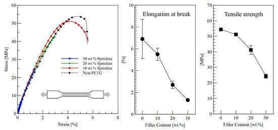 As with similar fillers, the addition of algae leads to changes in material properties. Figure 6 shows the results of tensile testing, visualized as stress–strain curves, for the printed XY-specimens with different algae contents. The data gathered revealed a decrease in tensile strength with increasing filler content. Up to 20 wt.% this decrease was nearly linear and was likely to be caused by the inert algae cells lowering the effective cross-sectional area of the material.