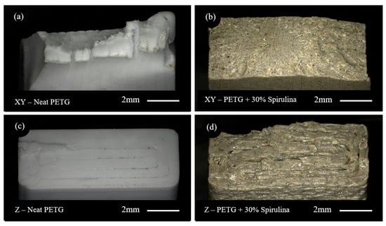 Microscope images of the fracture surfaces after tensile tests: (a) neat PETG loaded along the layer lines, (b) PETG with 30 wt.% algae loaded along the layer lines, (c) neat PETG loaded perpendicular to the layer lines, (d) PETG with 30 wt.% algae loaded perpendicular to the layers.
