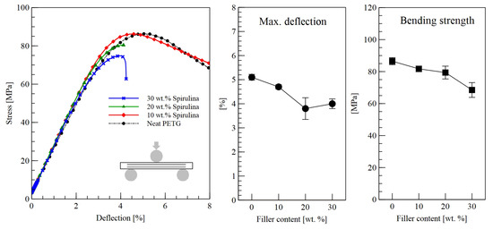 Results from three-point bending tests for different algae contents with forces applied perpendicular to the print direction: stress–deflection curve, deflection at max applied stress and bending strength, including standard deviations.