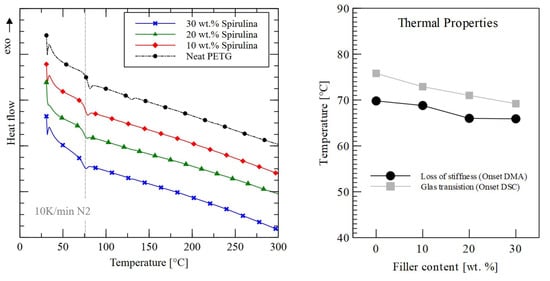 As with the virgin PETG, the heat flux curves of the compounded materials showed no endothermic crystallization peak after glass transition, indicating pure amorphous behavior. The algae did not influence the crystallization of the material. Similarly to the DSC results, DMA analysis showed a marginally reduced temperature operating range for the compounded filaments. Specimens with 30 wt.% algae content experienced a temperature-related drop in stiffness at 66 °C, approx. 4 degrees ahead of pure PETG.