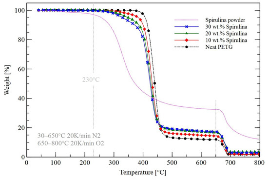 Results of TGA analysis: weight loss curves for filaments containing various amounts of algae filler in contrast to decomposition behavior of neat PETG and neat algae powder.