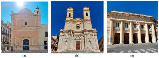 Landmarked buildings in Villanova: (a) Church of Saint Efisio in Stampace; (b) Collegiata di Sant’Anna Church; and (c) Civil hospital.