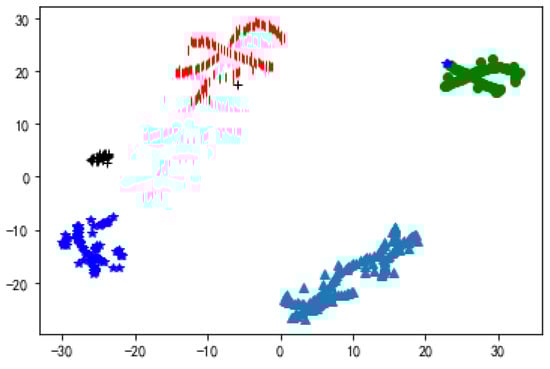 In this study, K-means was used for cluster analysis. The experiment found that when the number of clusters n_clusters = 5, the silhouette coefficient reached the maximum value of 0.2030. It indicated that the sample data were clustered into categories “0”, “1”, “2”, “3”, “4”, and “5” to achieve the best results. The clustering effect is shown in Figure 2. “+”, “△”, “☆”, “|”, and “·” represent students of a label category. Thus, Hypothesis 1 is supported.