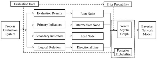 There are two main steps in establishing a Bayesian network model: determining the Bayesian-network-directed acyclic graph and conditional probability parameters. The Bayesian nodes correspond to each index item of the process-evaluation index system on a one-to-one basis. The corresponding nodes were connected with directed edges to form a Bayesian network based on the process-evaluation index system. Then, the score of the process evaluation data was used as the node-conditional probability distribution of the Bayesian network to determine the conditional probability parameters of the Bayesian network. The specific process is shown in Figure 3.