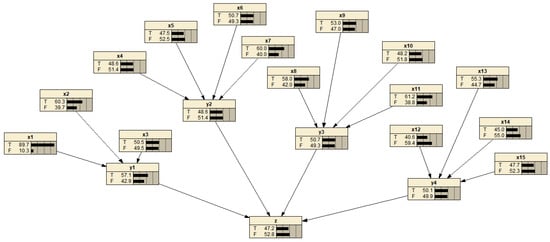 In this study, the student process-evaluation data were used as training data, and the Netica software was used to establish a Bayesian network model of the student process-evaluation data, as shown in Figure 4. The probability and distribution law of each evaluation index were obtained, which could be used as the Bayesian network model. The prior probability and likelihood function of the node were used.