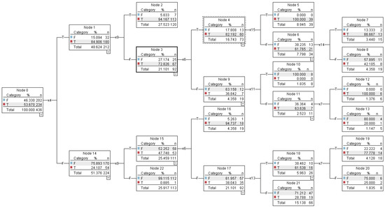 The above discretized data were input into SPSS Modeler18. Then, after modeling using C5.0, the decision-tree-classification-structure diagram was obtained, which is shown in Figure 5. The data show that the estimated accuracy of the model is 89.68%.