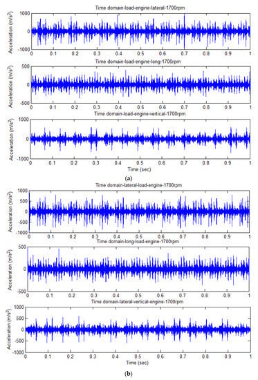 Vibration acceleration signals in the time domain at 1700 rpm engine speed in the lateral, longitudinal, and vertical directions. (a) Without a magnetic field. (b) Diesel fuel under a 1000-gauss field.