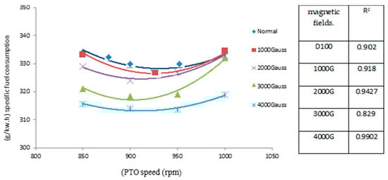 The maximum amount of specific fuel consumption reduction compared to control fuel was 2.3% for 4000 gauss. The coefficient of determination (R2) related to the regression equations was fitted and shown on the engine specific fuel consumption data as a function of engine speed for each magnetic field density. Duncan’s multiple range tests were used to compare whether the mean values of the engine vibration and specific fuel consumption varied significantly when the engine speed and magnetic field density changed. The results of Duncan’s multi-range test are shown in Table 6. Letters (a, b, c, etc.) were utilized to find whether mean values had notable differences at a 0.5% probability level or not using Duncan’s multiple range tests. The same letters indicate that there was no remarkable difference at the 0.5% probability level. Moreover, other surveys conducted by scientists approved the results of this study. For instance, in an investigation, the experimental results showed that the fuel consumption of the diesel engine was less when the engine had a magnetic field than that without it at a higher load. The results showed that consumption of the fuel with a magnetic field was less. The reduction in fuel consumption was about 8% [35].