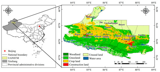 UANSTM (42°45′–46°8′ N, 81°46′–88°58′ E) is the most economically developed area and an economic development center of the Xinjiang Uygur Autonomous Region in northwest China, located adjacent to the Gurbantunggut Desert to the north. It has a total area of approximately 95,400 km2, complex topography, and a temperate continental arid climate [28]. UANSTM includes the Wu-Chang urban economic zone with Urumqi City as the center, the Shihezi-Manasi-Shawan urban economic zone with Shihezi City as the center, and the Kuitun-Wusu-Kelamayi “Golden Triangle”. By incorporating various factors, such as urban development level and natural environment, this study considered Urumqi City, Shihezi City, and Kelamayi City as the axes and selected key cities in the economic belt, including Changji City, Fukang City, Kuitun City, Hutubi County, Manasi County, and Shawan County as the study area (Figure 1). UANSTM has the highest economic level, most developed transportation, densest population, and most concentrated industries in Xinjiang. At the end of 2018, the total population of the urban agglomeration was 5.92 million people, accounting for approximately a fifth of the total population of Xinjiang, with a gross domestic product of CNY 656.6 billion. This is the main area for new urbanization in Xinjiang in the future and a strategic core area for social and economic development [29].