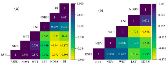 Mean correlation of each indicator with (a) RSEInew and (b) RSEI.
