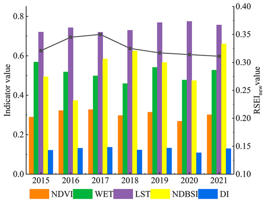 The annual mean value trends for the five ecological factors and RSEInew in UANSTM from 2015 to 2021 are shown in Figure 4. The overall annual average value of RSEInew demonstrated a decreasing trend, with a 3.12% rate of decline. The different years initially showed an increasing trend, followed by a decreasing trend. RSEInew increased from 0.321 in 2015 to 0.350 in 2017 and decreased to 0.311 in 2021. Similar to RSEInew, the annual average WET decreased by 7.22%. The annual mean values of the LST, NDBSI, and DI increased by 5%, 33.6%, and 6.61%, respectively.