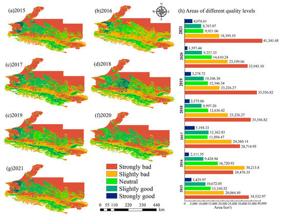 As shown in Figure 5, the area with “strongly bad” ecological environmental quality increased by 8% in 2021 to approximately 6808.71 km2. The area with “slightly bad” ecological environmental quality decreased by 2.17% to approximately 1668.94 km2. The area with “neutral” ecological environmental quality decreased by 4.2%, and that with “slightly good” and “strongly good” ecological environmental quality decreased by approximately 1.61%. The grade transformation of RSEInew in the study area from 2015 to 2021 was mainly concentrated between “strongly bad” and “neutral.” Compared to other years, the RSEInew in 2017 was higher, indicating that the ecological environmental quality had improved dramatically.