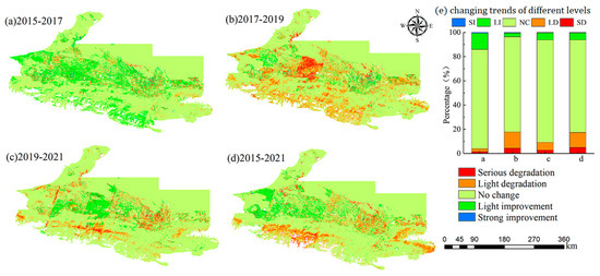 To discover the dynamic characteristics of ecological environmental quality during different periods, the RSEInew of recent and previous years in the study area were subtracted to obtain the spatial difference (Figure 6). Figure 6 shows that the RSEInew in 2017 improved more than in 2015. Compared with 2017 and 2021, RSEInew showed a decreasing trend in 2019, and the deterioration area accounted for 17.77% and 9.13% of the total study area, respectively. Compared with 2015, the RSEInew deterioration area in 2021 was larger than the improved area, with the deterioration and improved areas accounting for 17.37% and 6.32% of the total area, respectively. Therefore, areas with degraded ecological quality are mainly located in the central cities, surrounding cities, and southern high-altitude areas. Areas where the quality of the ecological environment remained unchanged were mainly located in the northern desert and high-altitude forested areas. Areas with improved ecological quality were mainly located in central and western farmland. Areas of strong improvement and serious decline were very small, accounting for less than 1% of the total area, and areas with stable ecological environmental quality accounted for approximately 75% of the total area.
